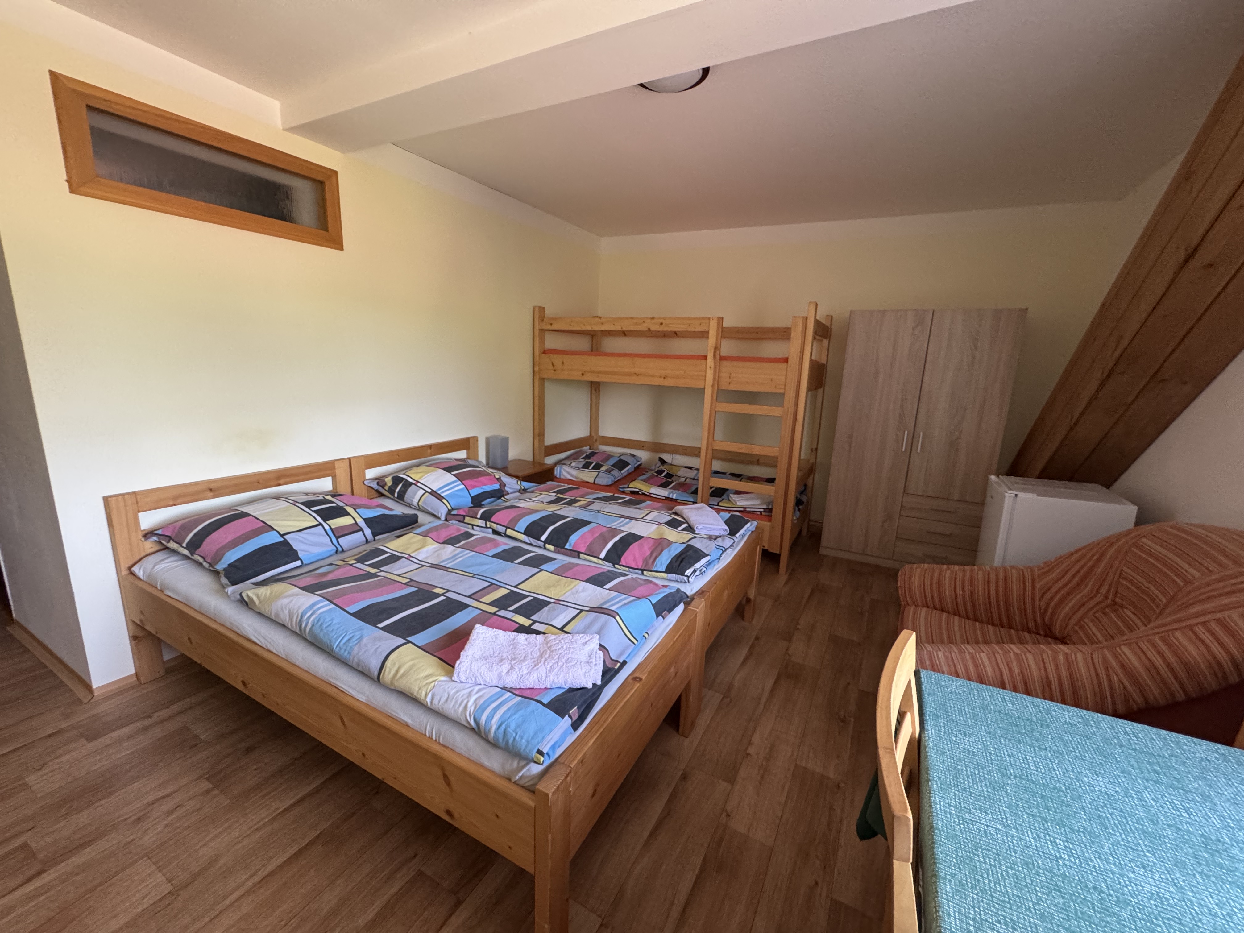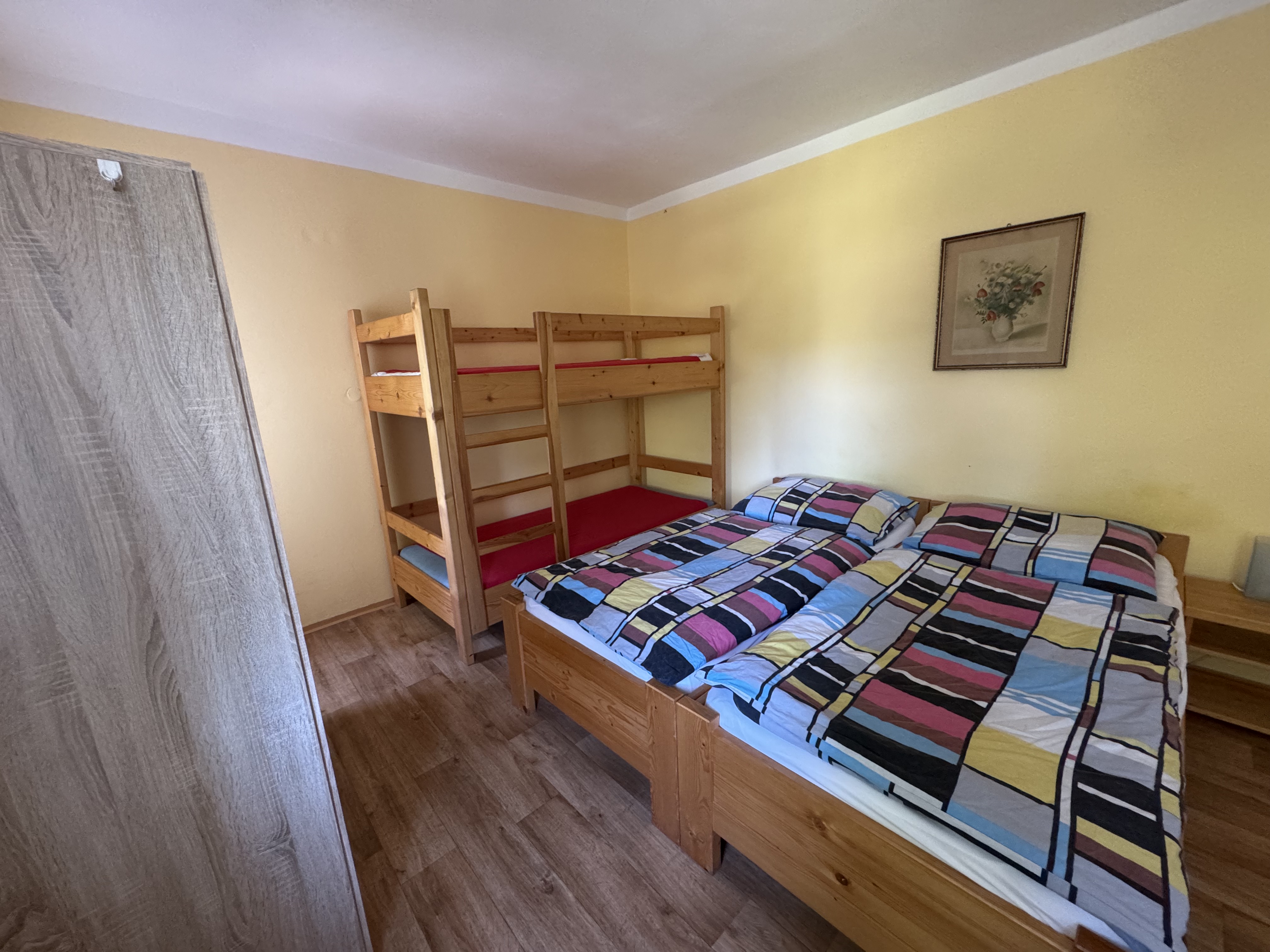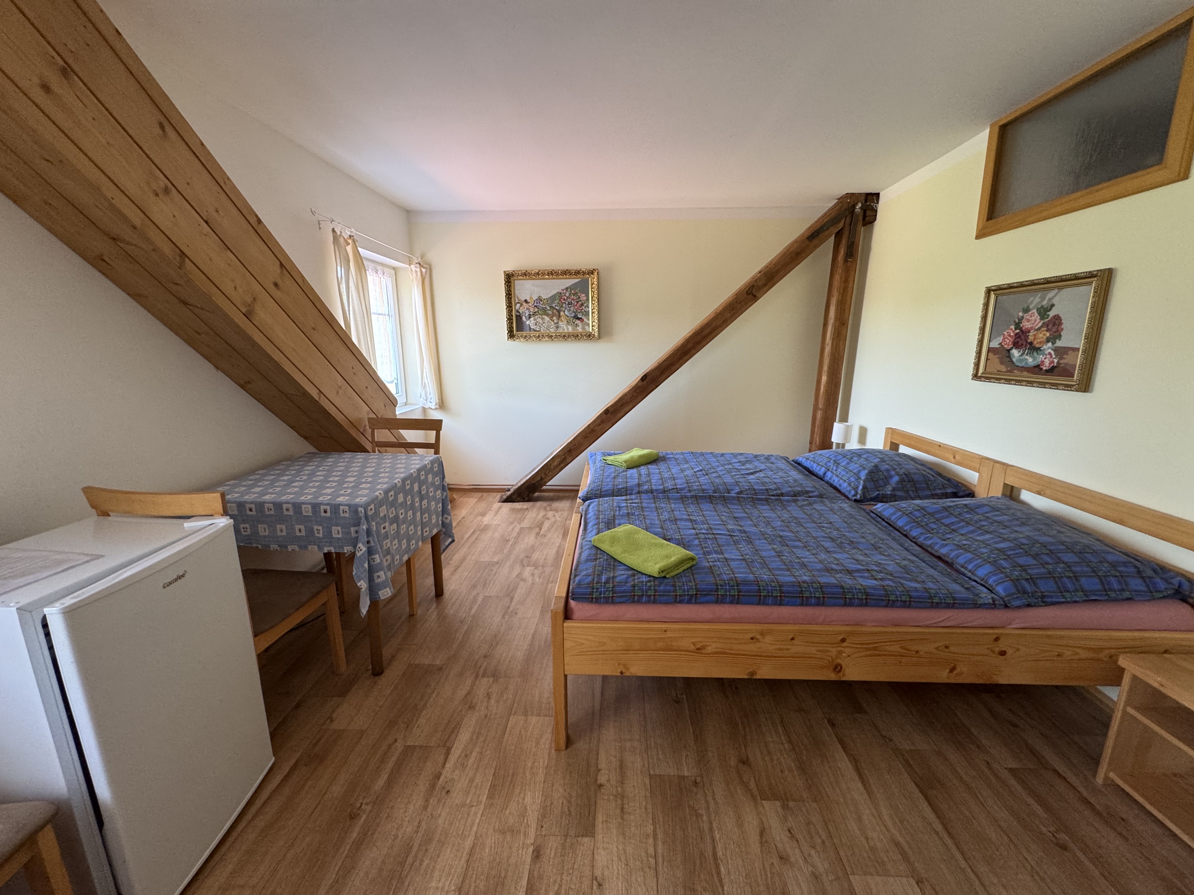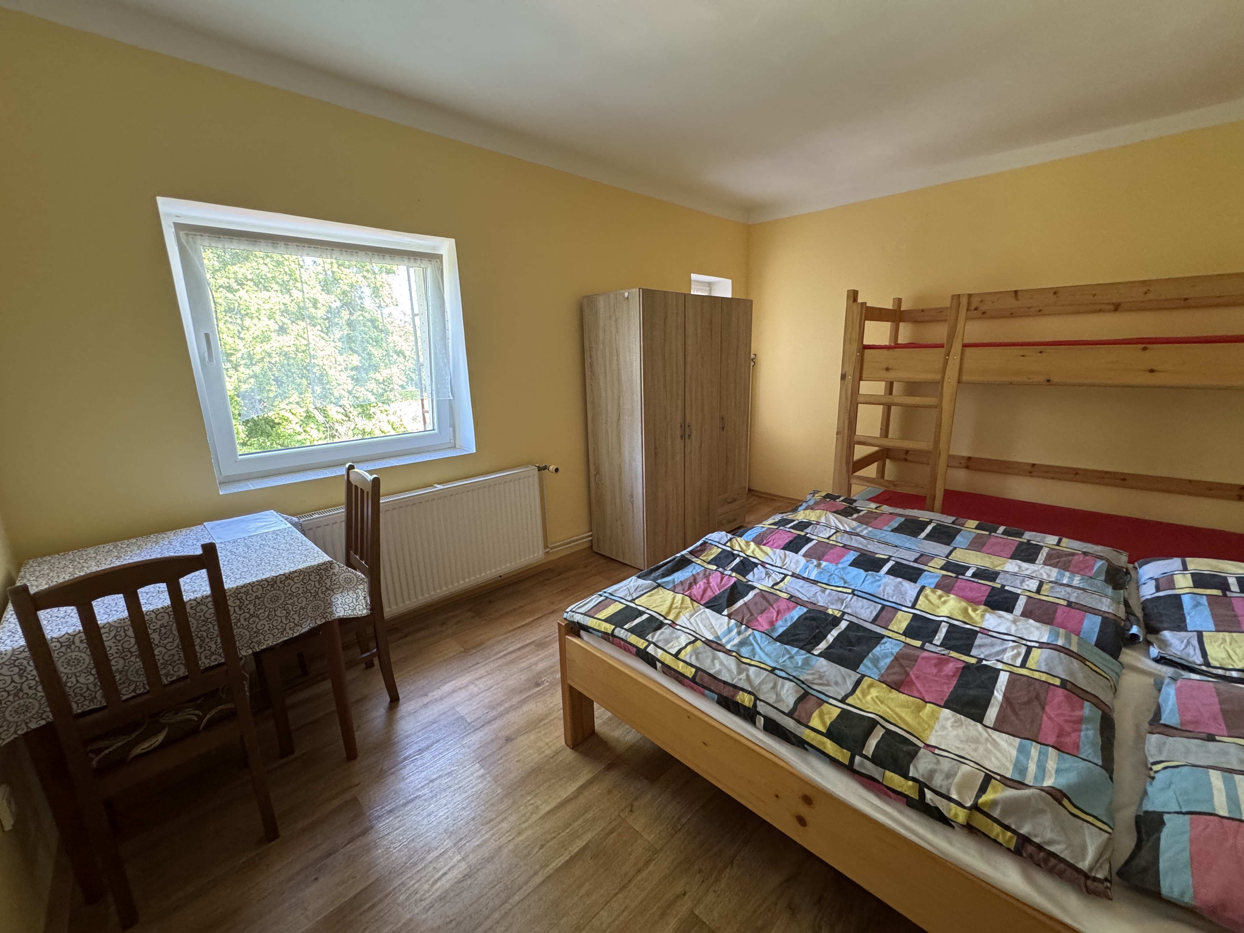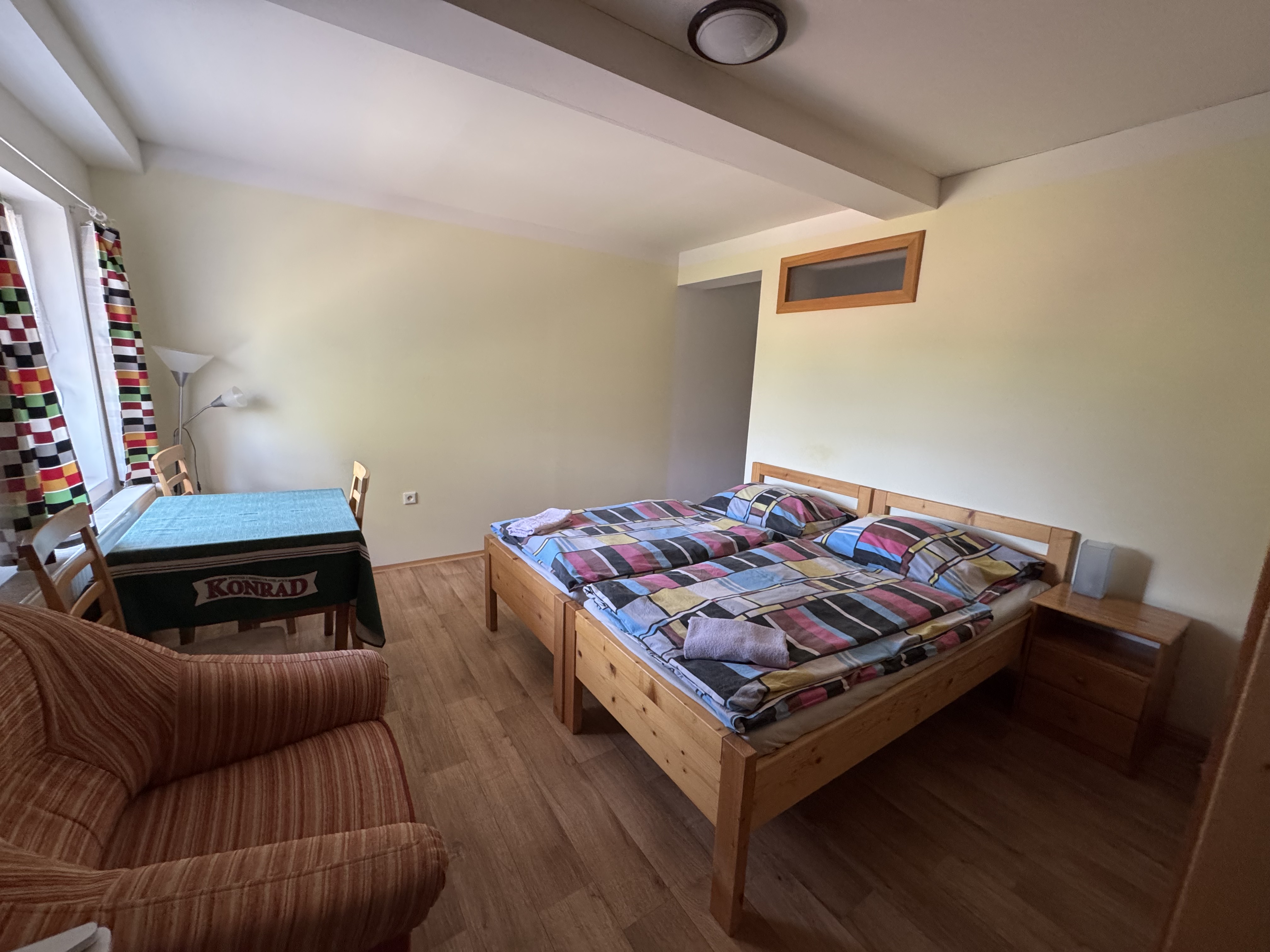 Dvoulůžkový pokoj. Sprchový kout, WC, kuchyňka, skříň. Lednice, varná konvice, elektrický sporák.